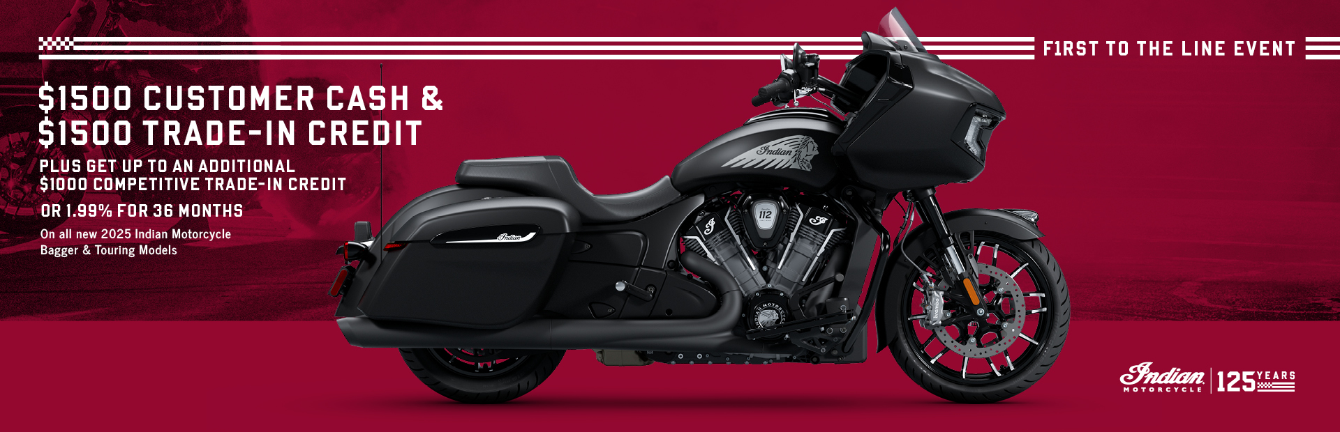 "*2025 Chieftain, Chieftain PowerPlus, Indian Challenger, Indian Pursuit, Roadmaster, Roadmaster PowerPlus, or Indian Springfield $1,500 Trade-In Credit This is a limited time offer which consists of $1,500 Trade-In Credit towards the purchase of a new model year 2025 Chieftain, Chieftain PowerPlus, Indian Challenger, Indian Pursuit, Roadmaster, Roadmaster PowerPlus or Indian Springfield models. Excludes Elite models. This offer is subject to change and may be extended or terminated without further notice. Offer may be combined with valid customer cash offers, but may not be combined with promotional financing. Limit one (1) Trade-In Credit per vehicle purchase. All rebates paid to dealer and are not redeemable for cash. Offer Valid: April 1 – 30, 2026.